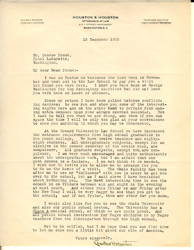 Though Houston invited Roscoe Pound to Howard on numerous occasions,